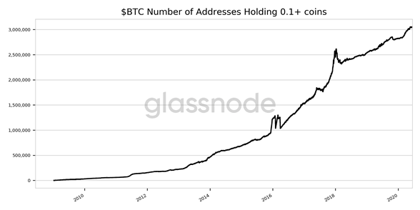 根据链上分析公司Glassnode的数据,持有至少0.1 BTC的比特币地址数量已经达到了一个新的历史新高。 3,054,282个地址数量打破了5月21日创下的前一个记录(3,054,070个)。