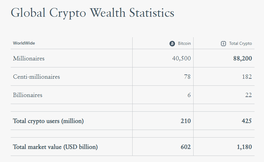 加密资产创造超 8.8 万名百万富翁,其中一半都是比特币“信徒”
