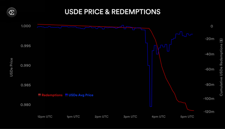 数据显示,USDe的赎回请求在一小时内突破1.2亿美元,这相当于协议日常赎回量的15倍。但Ethena的反应速度令人意外。